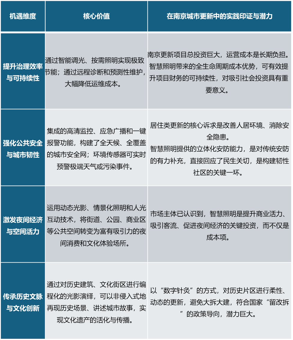 城市更新正當(dāng)時! 照明集團(tuán)以智慧照明探索城市新圖景城市更新作為推動城市結(jié)構(gòu)優(yōu)化、功能完善和品質(zhì)提升的關(guān)鍵舉措,已從“物質(zhì)空間修復(fù)”邁向“數(shù)字化、智能化、綠色化協(xié)同升級”的國家戰(zhàn)略階段。在這場城市發(fā)展的宏大敘事中,南京照明集團(tuán)立足城域級新市政綜合運營商定位,深度探索智慧照明賦能城市更新的內(nèi)在邏輯與實踐路徑,聚焦不同場景下的賦能機(jī)制與應(yīng)用潛力,讓智慧照明成為提升項目價值、創(chuàng)新運營模式的關(guān)鍵力量。 不止于“亮”:智慧照明的角色重塑與機(jī)遇分析 智慧照明從“節(jié)能”向“平臺”的演進(jìn)認(rèn)知,已在南京的城市更新實踐中得到了印證。智慧照明已從城市空間的附屬工具,上升為具有平臺效應(yīng)的融合性基礎(chǔ)設(shè)施,是推動城市從物理空間改造走向數(shù)字化、智能化孿生升級的關(guān)鍵支點。扎根南京本土實踐,集團(tuán)深刻洞察到智慧照明在城市更新中的四大價值爆發(fā)點: